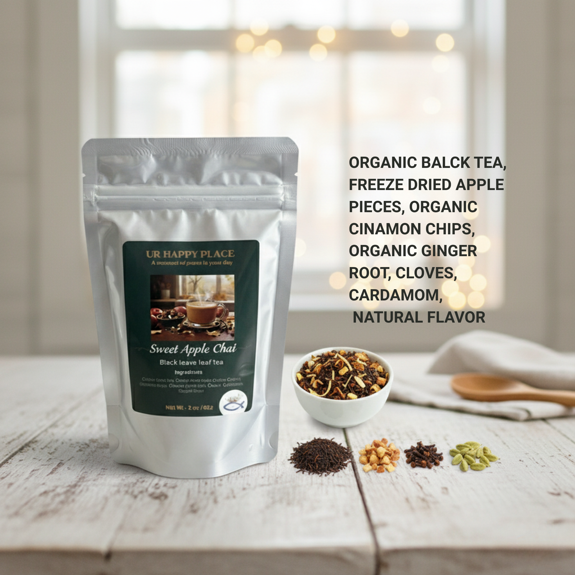 Organic black tea, freeze-dried apple pieces, organic cinnamon chips, organic ginger root, cloves, cardamom, natural flavor.
